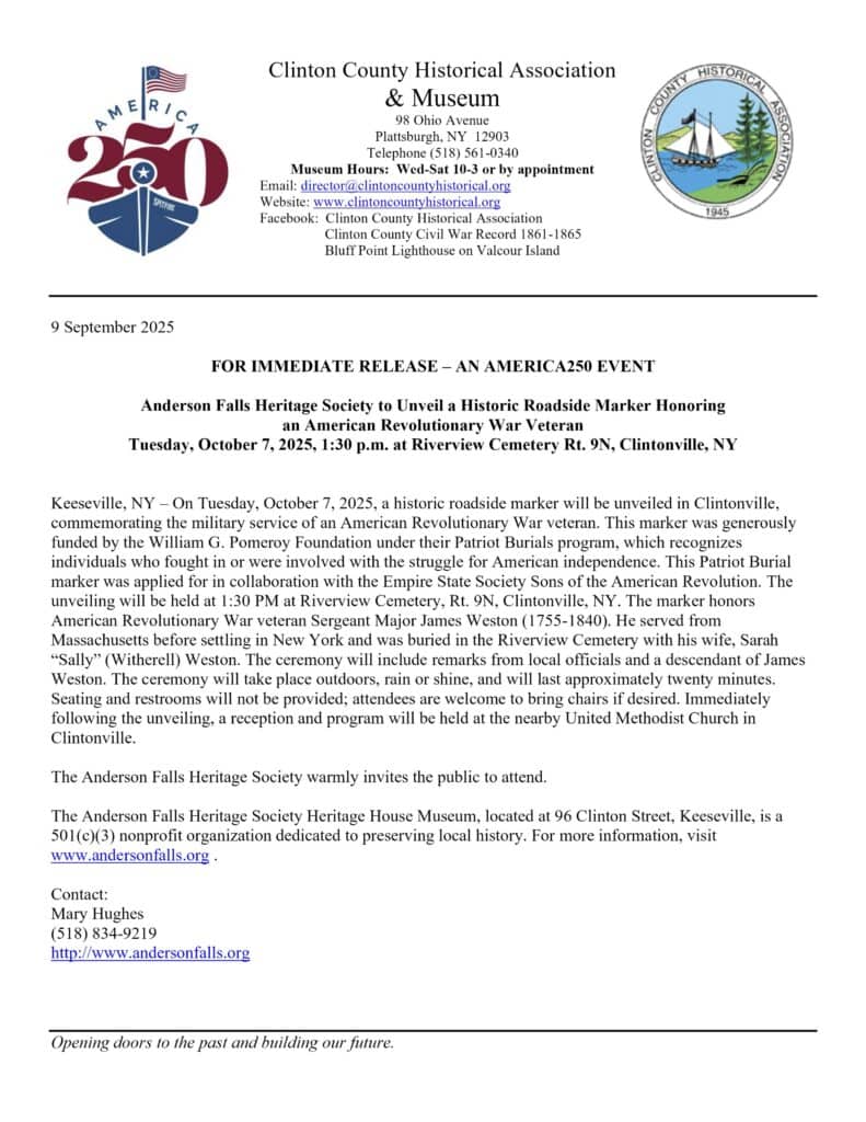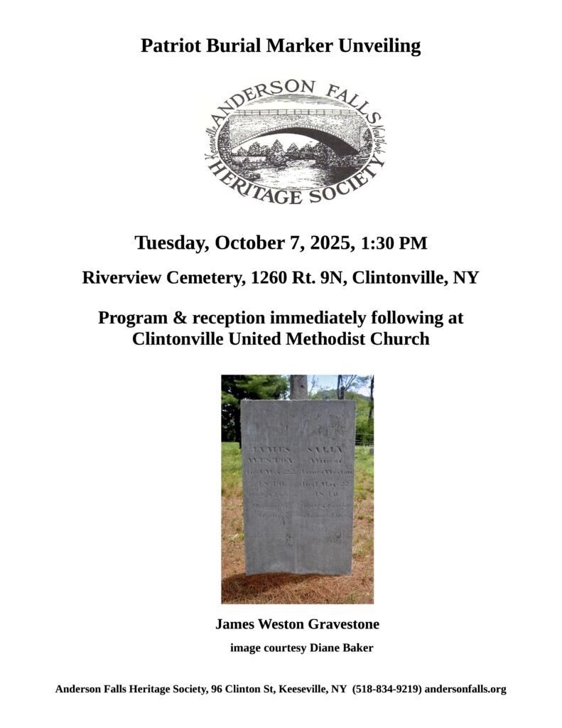 The unveiling will be held at 1:30 PM at Riverview Cemetery, Rt. 9N, Clintonville, NY. The marker honors American Revolutionary War veteran Sergeant Major James Weston (1755-1840). He served from Massachusetts before settling in New York and was buried in the Riverview Cemetery with his wife, Sarah “Sally” (Witherell) Weston. The ceremony will include remarks from local officials and a descendant of James Weston. The ceremony will take place outdoors, rain or shine, and will last approximately twenty minutes. Seating and restrooms will not be provided; attendees are welcome to bring chairs if desired. Immediately following the unveiling, a reception and program will be held at the nearby United Methodist Church in Clintonville.